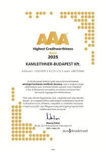 Nagy megtiszteltetés cégünk számára, hogy a Dun & Bradstreet objektív cégminősítése alapján a legjobbak között szerepelhetünk. Nagy figyelmet fordítunk arra, hogy a piacon tisztességesen járjunk el, így fontos számunkra, hogy egy külső szakértő is megerősítette, hogy cégünk fizetésképtelenségi valószínűsége kiemelkedően alacsony. Hisszük, hogy a Dun & Bradstreet Tanúsítvány segítségével ügyfeleink, szállítóink, munkavállalóink felé is tovább fokozzuk azt a bizalmat, mely egyre fontosabb a hosszú távú, szilárd üzleti kapcsolatokban. Azzal, hogy egy független, nemzetközi szakértő elismerte cégünk stabilitását, azt az üzenetet hordozza számunkra, hogy jó úton járunk cégünk építésében, fejlesztésében. Mivel vállalkozásunk minősítése szigorúan szakmai szempontok alapján történt, arra sem pályázni, sem jelentkezni nem lehet, így a Dun & Bradstreet Tanúsítvány valóban pozitívan különbözteti meg cégünket a piacon.